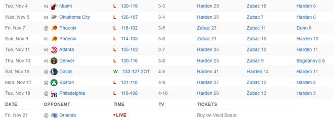 快船:哈登31分8助攻5篮板5个三分球,祖巴茨14分19篮板,科林斯9分,保罗9分。