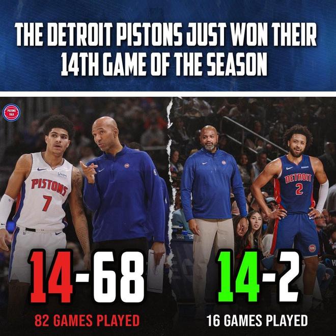 在两年前的2023-24赛季,致力于摆烂的活塞队整个赛季才取得了14胜并排名当赛季倒数第一,在2023年他们还遭遇令人震惊的28连败,这追平了NBA历史上的跨赛季连败纪录。如今,他们取得了自2003-04夺冠赛季以来的最长连胜12连胜,开季仅用16场就追平了23-24赛季的胜场数。