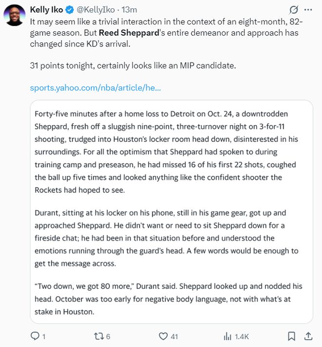 火箭记者凯利-伊科写道:在过去八个月里82场比赛中,谢泼德爆发一场或许微不足道,但自从杜兰特到来后,谢泼德的打球态度、积极性、打法都发生了变化,他似乎有了MIP的可能性。