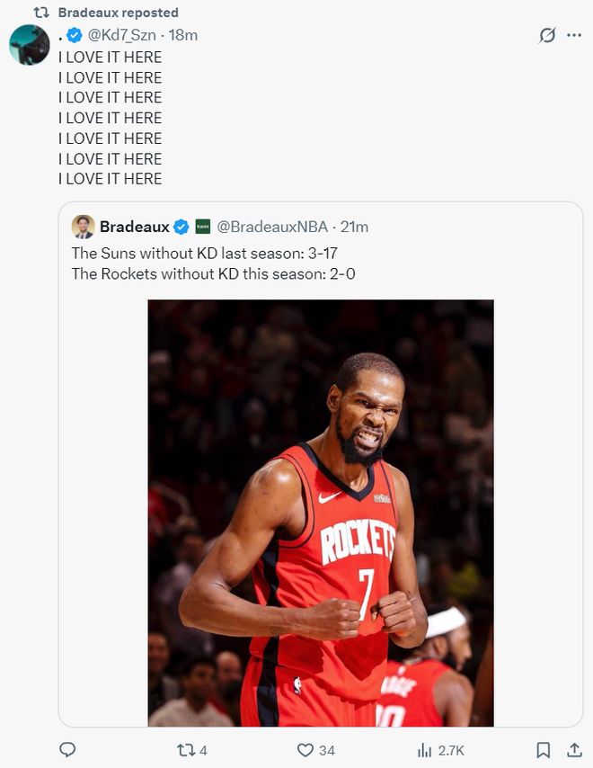 上赛季没有杜兰特的太阳战绩3胜17负,而本赛季KD缺席的两场比赛火箭接连击败太阳、勇士。