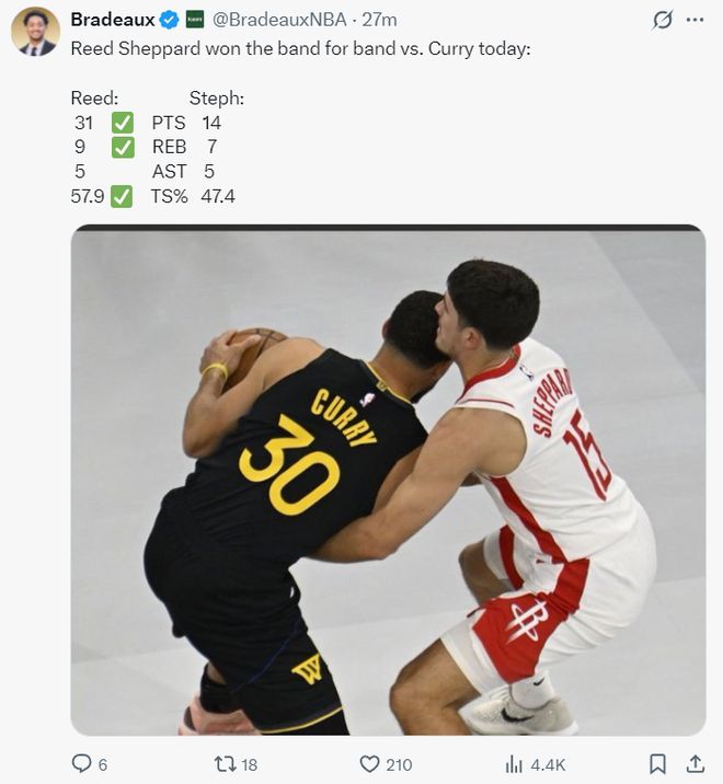 火箭记者Bradeaux晒出谢泼德与库里的数据,谢泼德得分呢、篮板、真实命中率都超过库里,这场比赛库里只有14+7+5+真实命中率47.4%。