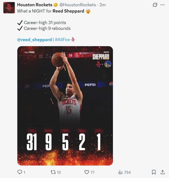 火箭队官方也晒出了谢泼德的数据,31分9篮板5助攻2抢断1盖帽,谢泼德是如此的全面,他本赛季的进步太快了。
