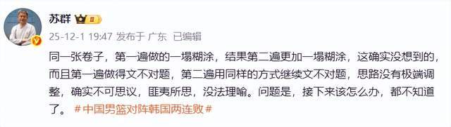 相较于杜锋,名嘴苏群就不藏着掖着了,直接一席话戳中中国男篮的痛处。苏群用一张试卷做比喻,他直言:“同一张卷子,第一遍做的一塌糊涂,结果第二遍更加一塌糊涂,这确实没想到的,而且第一遍做得文不对题,第二遍用同样的方式继续文不对题,思路没有极端调整,确实不可思议,匪夷所思,没法理喻。问题是,接下来该怎么办,都不知道了。”
