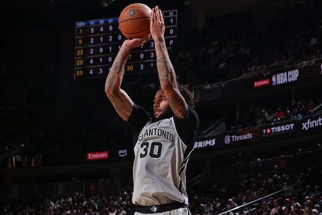 本场比赛中,马刺的替补锋线大将朱利安·尚帕尼(Julian Champagnie)虽然没有找到自己的手感,但是他在防守端的作用还是相当突出的。尚帕尼全场出场26分34秒,投篮5中1,三分线外5中1,得到了3分8篮板2助攻1盖帽的数据,还有1次失误和1次犯规,正负值为-3。尚帕尼在进攻端确实是手感一般,他的得分能力和投射能力都完全没有发挥出来,他也没有在这方面起到任何的效果,这也并不是他应有的水准。不过尚帕尼在防守端的表现非常突出,他的防守积极性和活力都是肉眼可见的,并且也是起到了很好的防守效果的。除此之外,尚帕尼在篮板争抢方面的表现同样是值得肯定的。尚帕尼虽然不在自己的最佳状态,但是他还是为球队的胜利做出了不小的贡献。